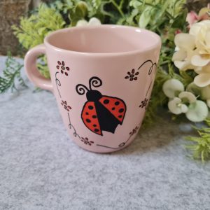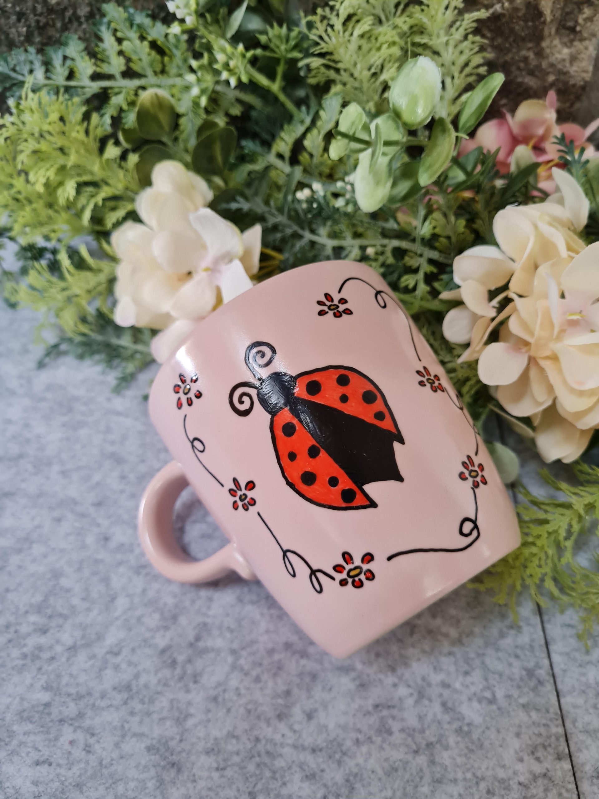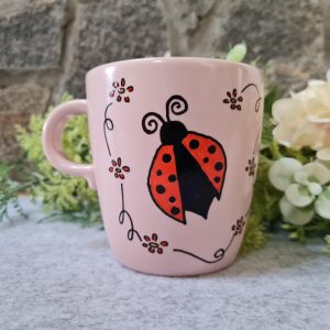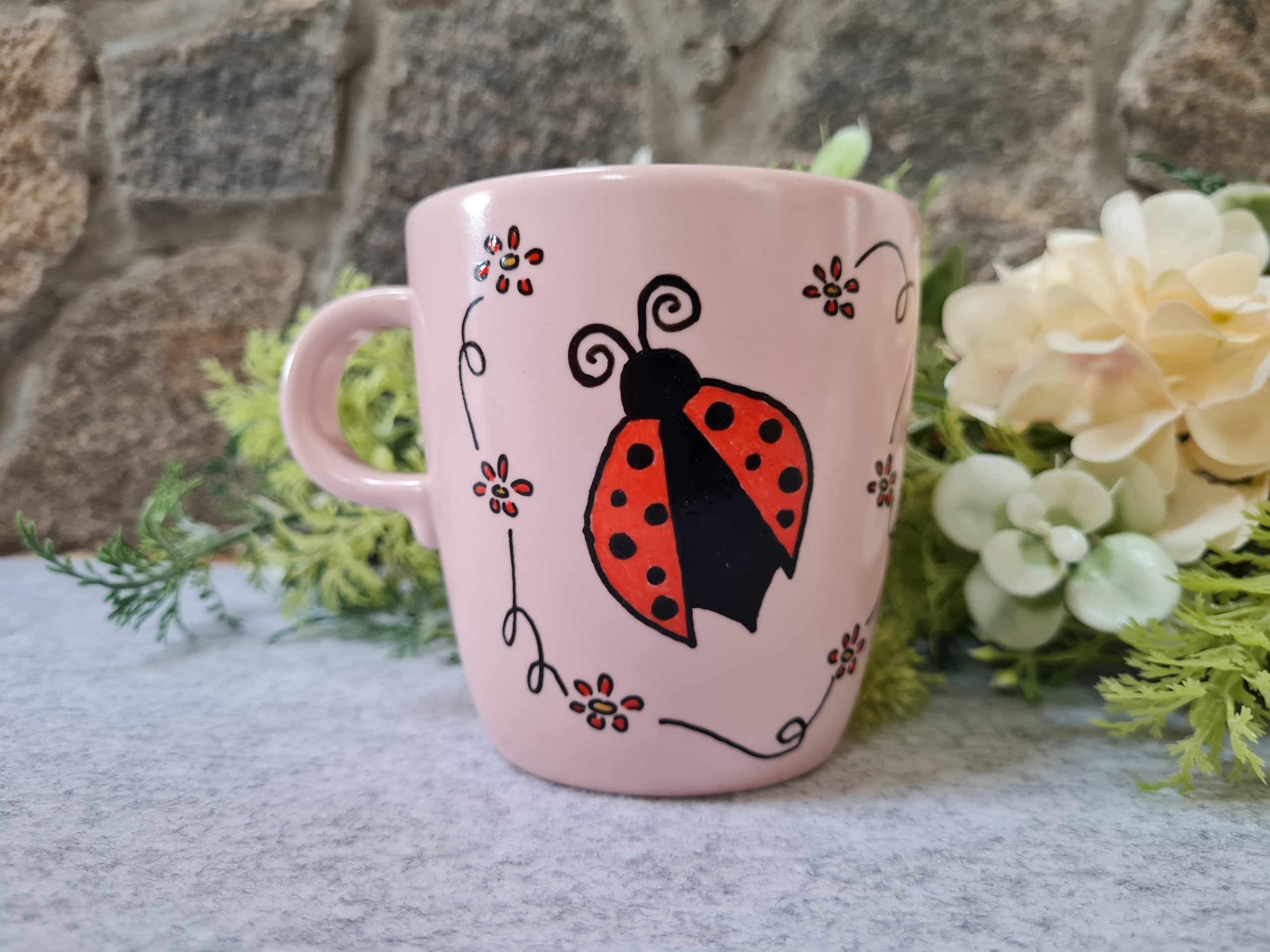Ročno poslikana s skodelica z motivom pikapolonice in drobnih rožic. Podari skodelico za rojstni dan ali pa nekomu polepšaj dan.